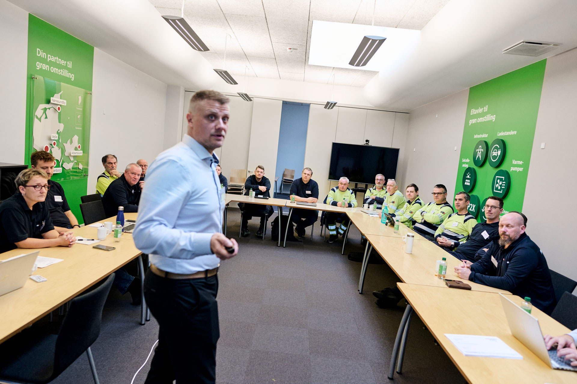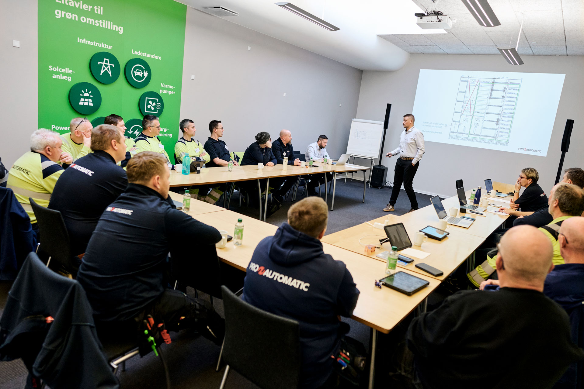 Den genanvendte tavle blev tilpasset og integreret i konferencerummet, som årligt danner ramme om mange gæster – fra teknikere og kunder til studerende og samarbejdspartnere. Et rum, hvor vidensdeling og opkvalificering er i centrum.